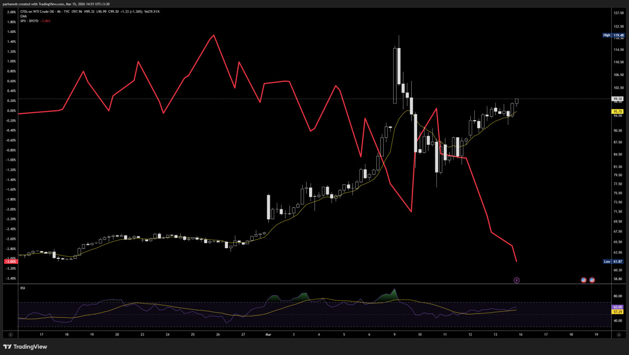 در این هفته، قیمت اس اند پی 500 تقریبا همبستگی منفی یک‌به‌یک با قیمت نفت داشت. یعنی هر بار که نفت بالا می‌رفت، بازار سهام پایین می‌آمد و برعکس. این رابطه حتی در معاملات شبانه‌ی قراردادهای آتی هم کاملا مشهود بود.