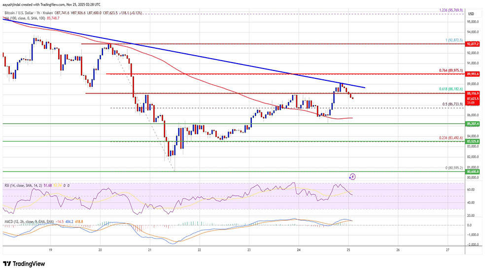 از نقطه نظر تکنیکال، قیمت بیت‌ کوین موفق شد بالاتر از سطح ۸۲ هزار دلار باقی بماند و پس از تشکیل یک کف قیمتی، یک موج بازیابی تازه بالاتر از مقاومت ۸۵ هزار دلار تشکیل دهد. این روند صعودی باعث عبور قیمت از مقاومت ۸۶,۵۰۰ دلار و سطح ۵۰ درصد فیبوناچی شد، اما همچنان فشار فروش در محدوده زیر ۹۰ هزار دلار قابل مشاهده است. همچنین یک خط روند نزولی با مقاومت ۸۹ هزار دلار در نمودار یک ساعته شکل گرفته که حرکت صعودی بیت‌ کوین را محدود کرده است. در حال حاضر بیت‌ کوین بالاتر از ۸۷ هزار دلار و میانگین متحرک ساده یک ساعته معامله می‌شود.