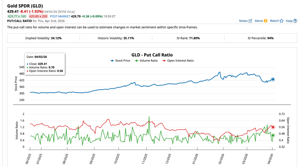نسبت پوت به کال صندوق قابل معامله SPDR Gold Shares (GLD) نشان میدهد که معاملهگران بازار آپشن چگونه نسبت به قیمت طلا پوزیشنگیری میکنند. در ۲۶ مارس، نسبت حجم پوت به کال ۱.۳۵ بود؛ یعنی حجم معاملات پوت بهمراتب بیشتر از کال بود و سنتیمنت نزولی غالب بود. نسبت اوپن اینترست در آن زمان ۰.۵۳ بود.