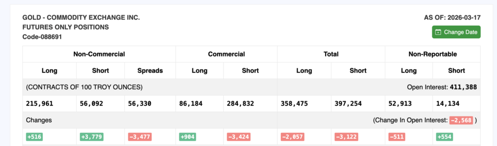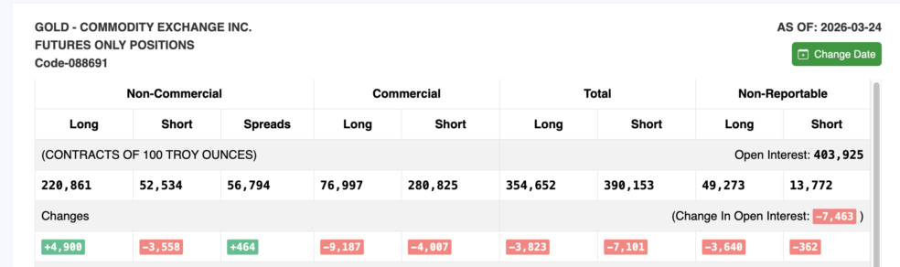 گزارش تعهد معاملهگران (COT) که هر هفته توسط کمیسیون معاملات آتی کالای آمریکا (CFTC) منتشر میشود، این تحلیل را تقویت میکند. گزارش ۲۴ مارس، آخرین گزارش موجود، نشان میدهد که پوزیشنهای لانگ غیرتجاری (سفتهبازانه) ۴,۹۰۰ قرارداد افزایش یافته و به ۲۲۰,۸۶۱ رسیده است. پوزیشنهای شورت نیز ۳,۵۵۸ قرارداد کاهش یافته و به ۵۲,۵۳۴ رسیده است. در ظاهر، این ارقام صعودی به نظر میرسند.