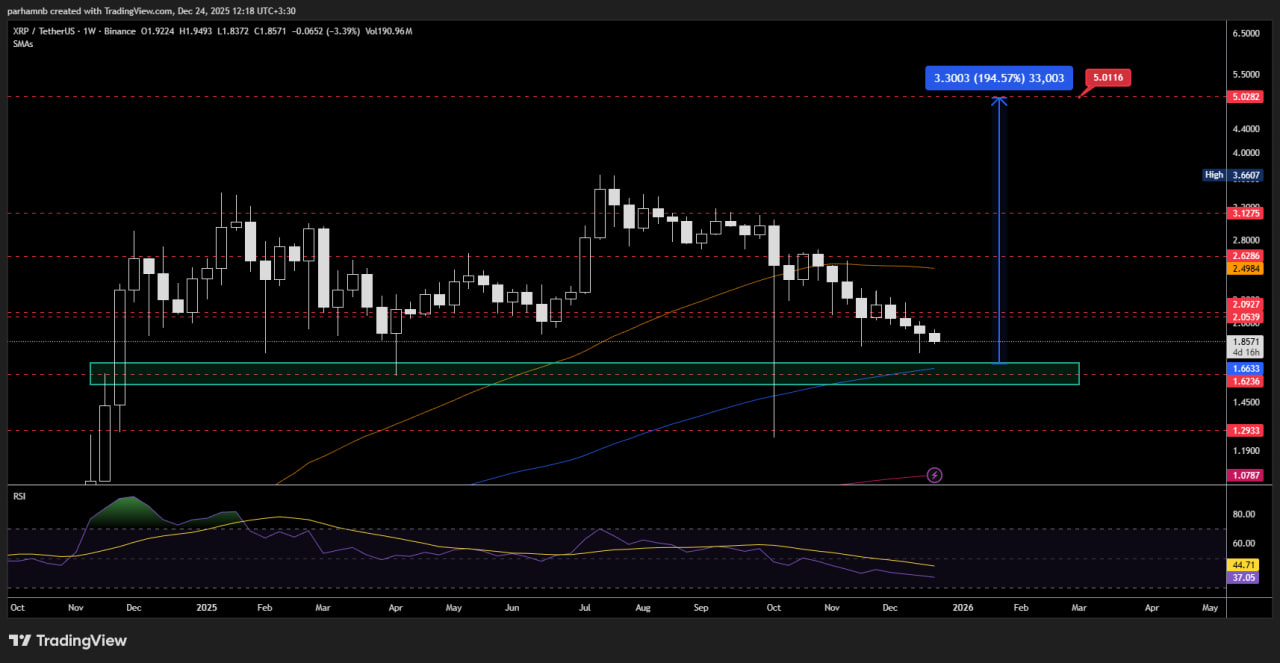 ریپل (XRP) که پنجمین ارز دیجیتال بزرگ بازار از نظر ارزش بازاری است، در حال حاضر زیر سطح حیاتی ۲ دلار معامله میشود و با قیمت ۱.۸۸ دلار نزدیک ۵۰ درصد از سقف تاریخی خود فاصله دارد. با این حال، ترکیب تحلیل تکنیکال و شناسایی محرکهای بنیادی، چشمانداز جذابی را برای رسیدن به هدف ۵ دلار در سال ۲۰۲۶ ترسیم میکند که معادل رشدی حدود ۲۰۰ درصدی خواهد بود.