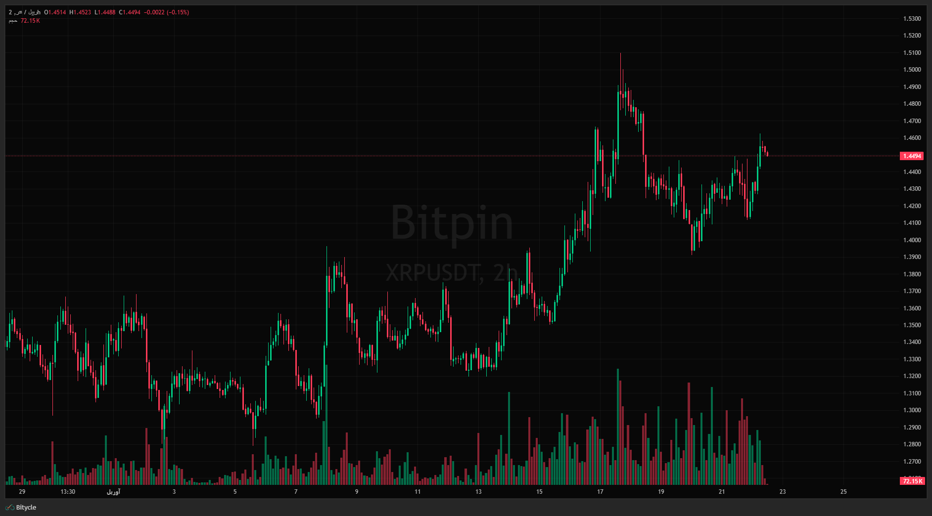 معاملهگران سطح ۱٫۴۴ دلار را بهعنوان نقطه محوری کوتاهمدت، ۱٫۵۰ دلار را بهعنوان سطحی که تأییدکننده تغییر روند پایدارتر خواهد بود و ۱٫۴۲ دلار را بهعنوان خطی که نشاندهنده شکست ناموفق است، زیر نظر دارند. ریپل بار دیگر در حال صعود است و این بار حرکت با حجم معاملات همراه شده است. ساختار قیمتی نسبت به تلاشهای قبلی تمیزتر به نظر میرسد، اما همچنان درست زیر مقاومت اصلی قرار دارد؛ به این معنا که برای تبدیل شدن به یک شکست کامل، باید عملکرد بهتری از خود نشان دهد.