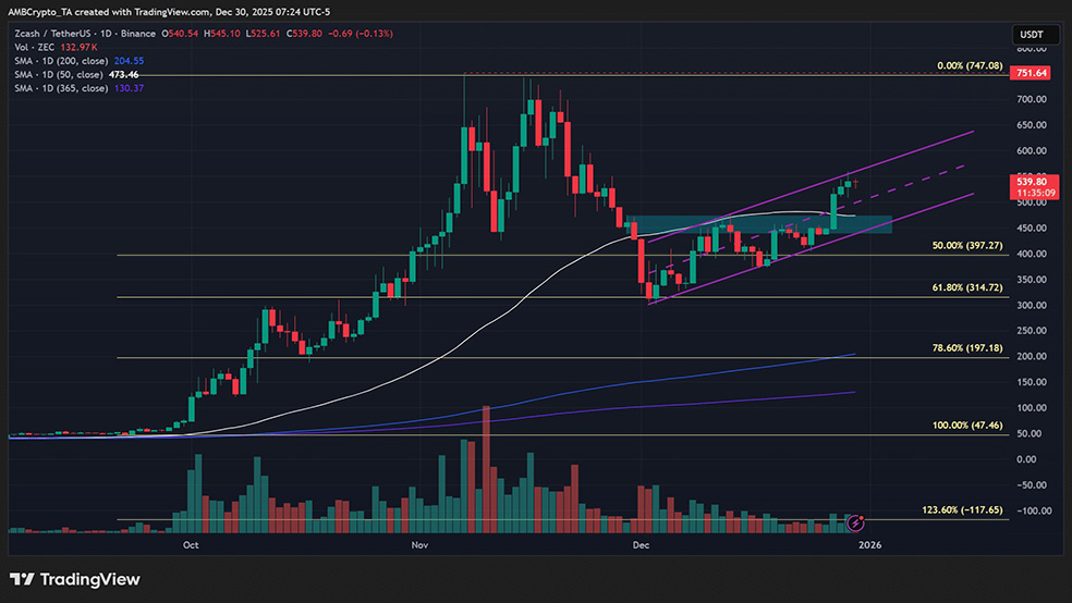 با این حال، مسیر قیمتی زیکش بسیار پرنوسان بوده است. این ارز پس از جهش بیش از ۱۰۰۰ درصدی در اکتبر و ثبت سقف تاریخی ۷۵۱ دلار، تا اوایل دسامبر به حدود ۳۲۰ دلار سقوط کرد. در زمان نگارش این مطلب، قیمت به ۵۳۹ دلار بازگشته و حدود ۳۵ درصد با سقف تاریخی فاصله دارد.
