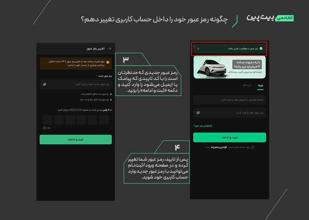 - پس از مشاهده نوار سبز رنگ تغییر رمز عبور موفق، در صفحه ورود/ثبتنام با رمز جدید وارد حساب کاربری خود شوید.