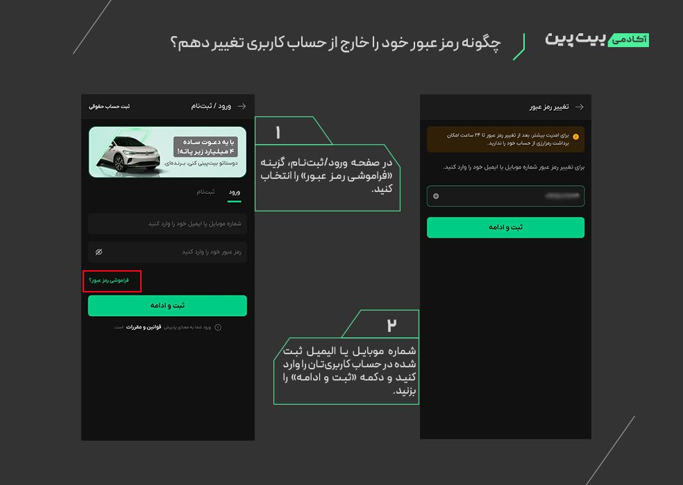 - ایمیل یا شماره موبایلی که با آن حساب کاربری خود را در بیتپین ساختهاید، در بخش مشخصشده وارد کنید.