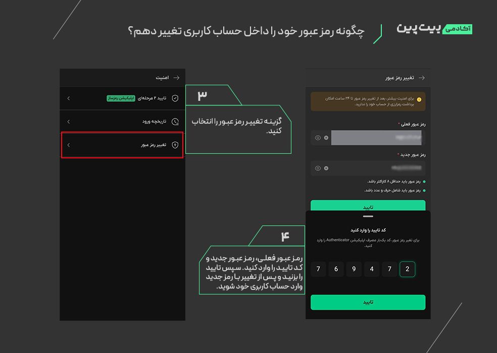 نکتهی خیلی مهم: توجه داشته باشید که پس از تغییر رمز عبور، تا ۲۴ ساعت امکان برداشت از کیف پول وجود ندارد.