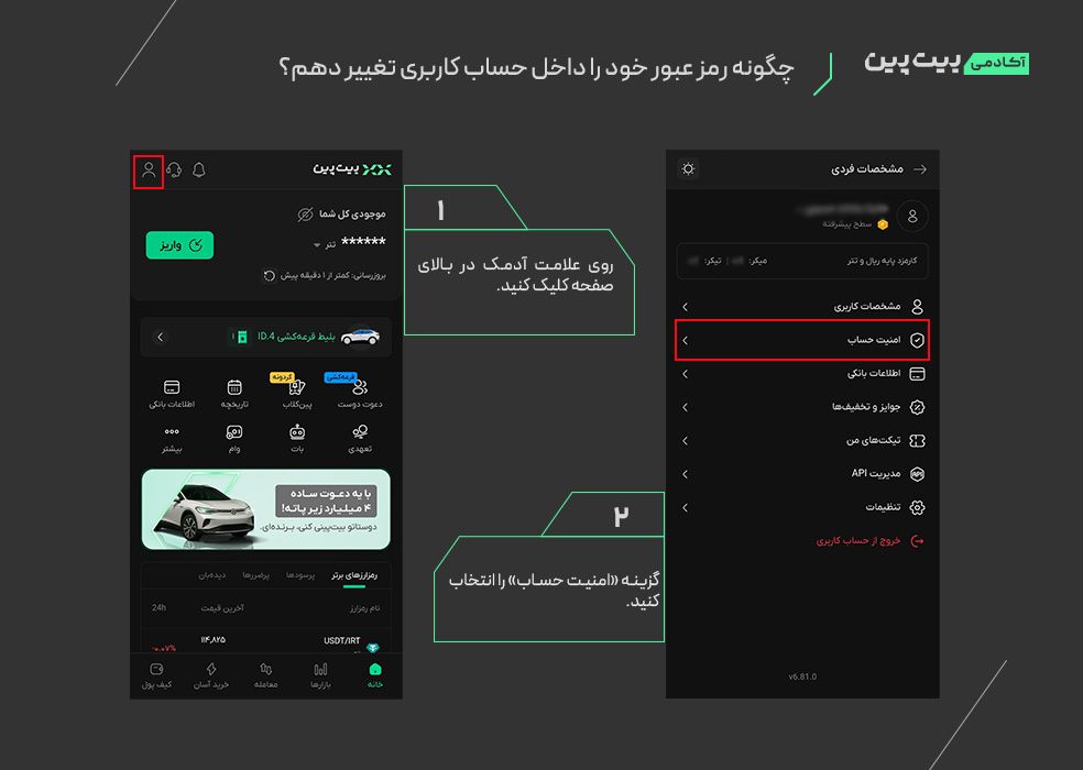 - گزینه «امنیت حساب» را انتخاب کنید و در صفحه جدید، روی گزینه «تغییر رمز عبور» بزنید.