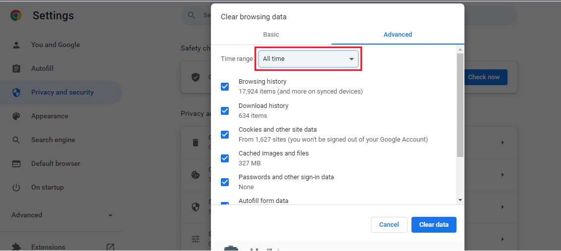 حالا در قسمت Time range تعیین کنید که کش مرورگر تا چه زمانی پاک شود. بهعنوان مثال ما برای پاک کردن کامل گزینه All time را انتخاب میکنیم. سپس گزینههای موردنظر خود را تیک زده و در آخر دکمه Clear data را میزنیم.