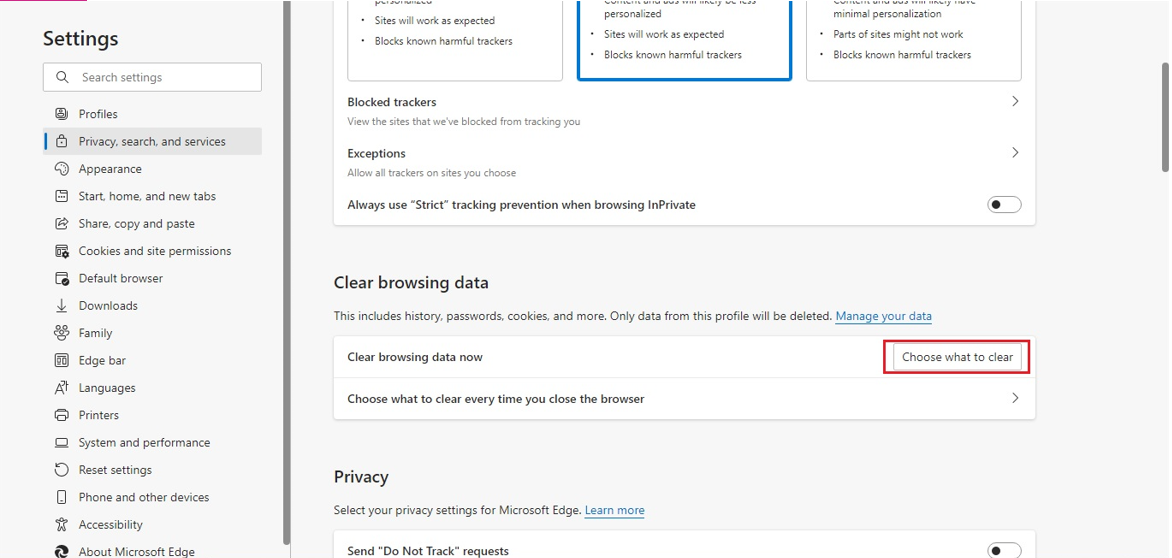 حالا گزینه Clear browsing data و سپس choose what to clear را انتخاب کنید.