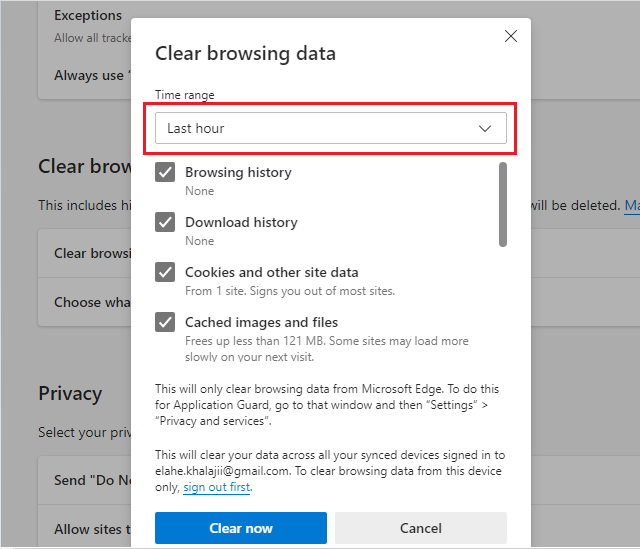 اکنون از قسمت Time range تعیین کنید که کش مرورگر تا چه زمانی پاک شود. در این بخش موارد موردنیاز خود را تیک زده و در آخر روی Clear Now کلیک کنید.