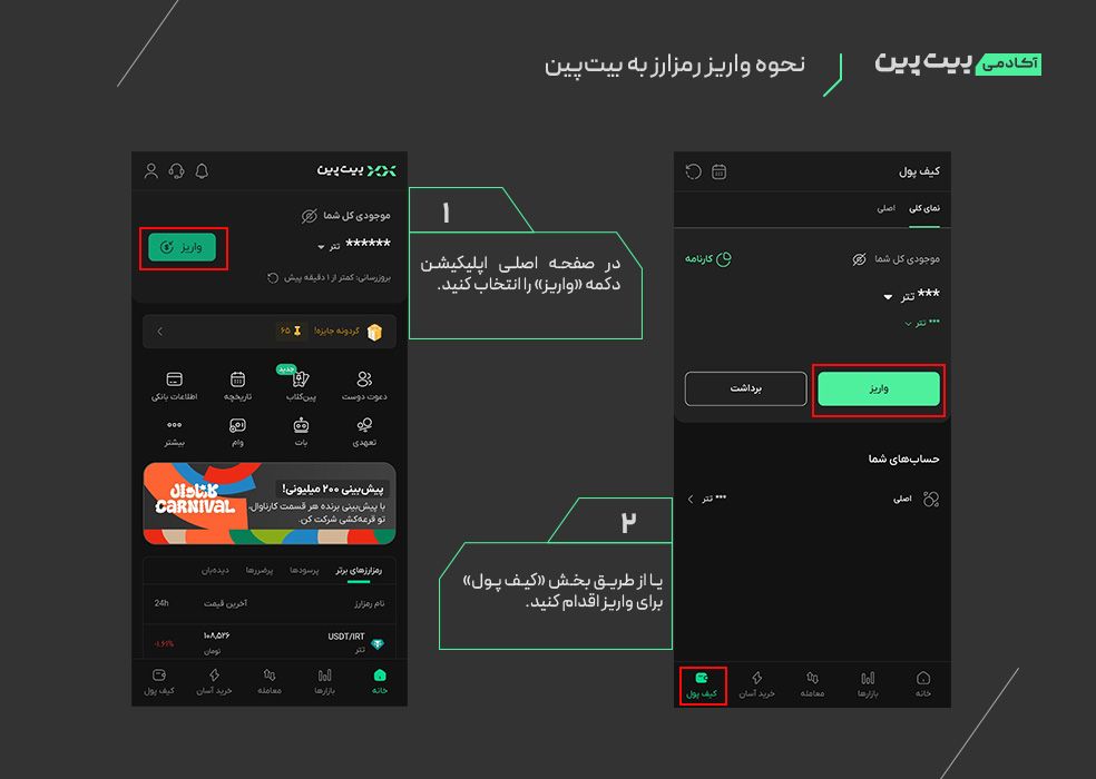 • از صفحه اصلی اپلیکیشن و وبسایت بیت‌پین، دکمه «واریز» را بزنید یا از بخش «کیف پول» برای واریز اقدام کنید.