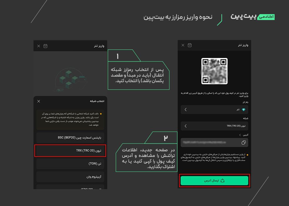 • در این صفحه آدرس را کپی یا اسکن کنید و از آن در پلتفرم یا اپلیکیشن مبدأ برای انتقال رمزارز استفاده کنید. می‌توانید از دکمه ارسال آدرس نیز برای به اشترک گذاشتن آدرس استفاده کنید.