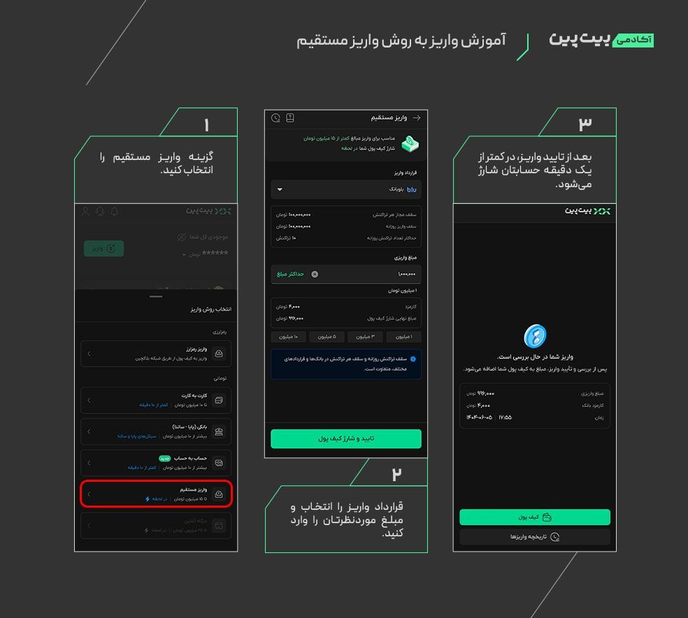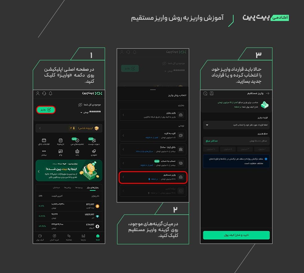 • در وبسایت یا اپلیکیشن بیت پین به بخش «واریز» و بعد «واریز مستقیم» بروید.