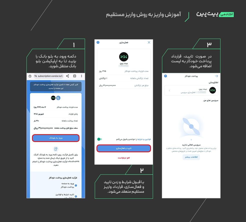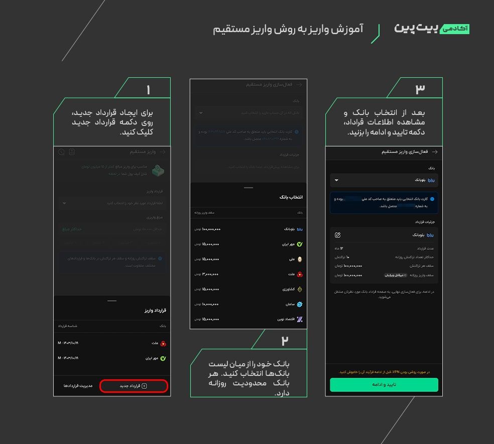 • در این صفحه می‌توانید قرارداد واریز را از میان گزینه‌های موجود انتخاب کنید، یا قرارداد جدیدی را ایجاد کنید. برای این کار باید فرم مجوز واریز مستقیم را تکمیل کنید. این فرم شامل ارائه شماره کارت و تأیید هویت است. پس از تأیید، بیت پین مجاز خواهد بود مبالغ تعیین‌شده توسط شما را به‌صورت خودکار برداشت و به کیف پولتان واریز کند.