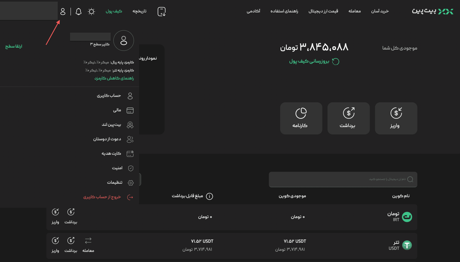 ۱. وارد حساب کاربری خود در بیتپین شده و روی نام کاربری کلیک کنید.
