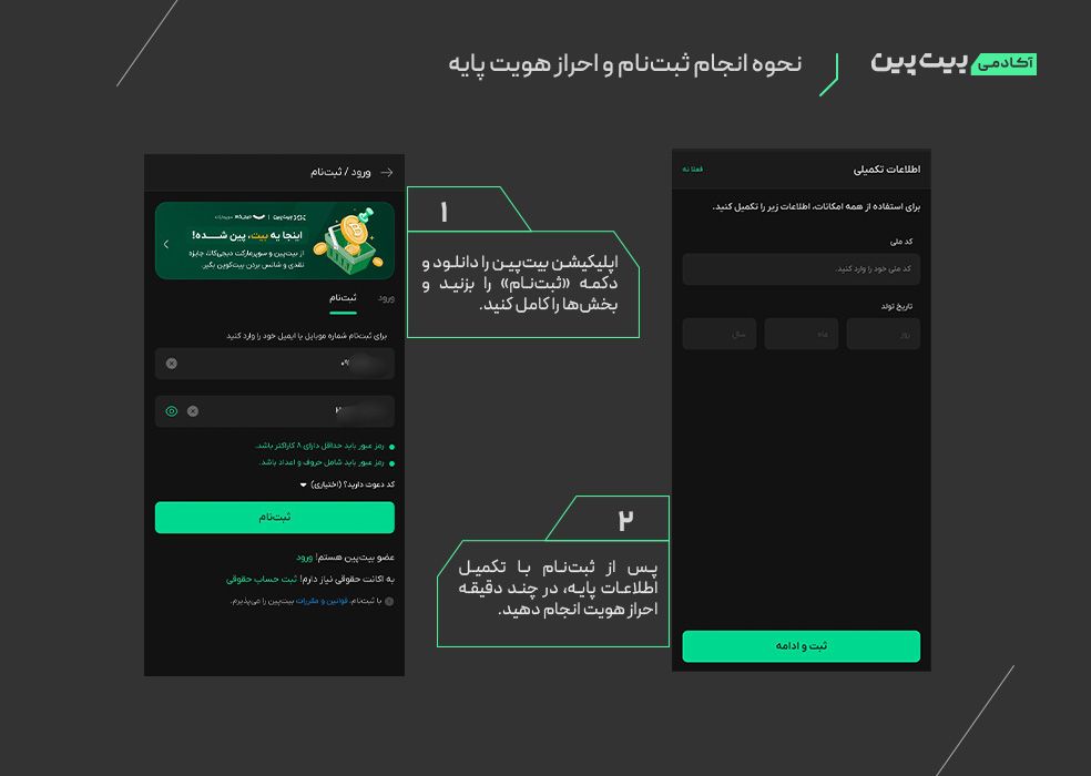 - با ورود به سایت یا اپلیکیشن خرید رمزارز بیتپین و انجام مراحل ثبتنام و احراز هویت پایه در چند دقیقه حساب کاربری خود را در بیتپین بسازید.