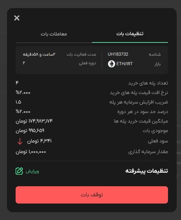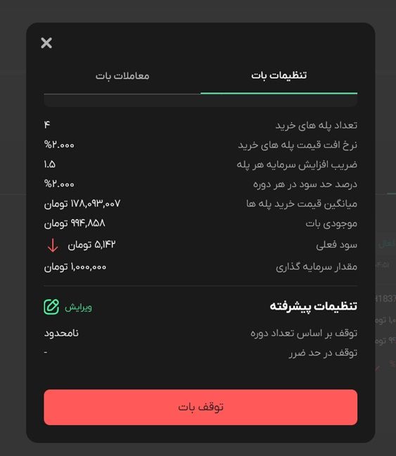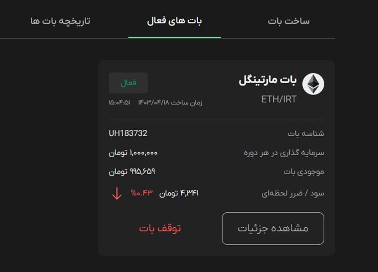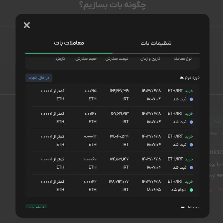 در ضمن می‌توانید تمامی سفارش‌های خود را در تب معاملات بات، که در قسمت جزییات هر بات وجود دارد، مشاهده کنید.