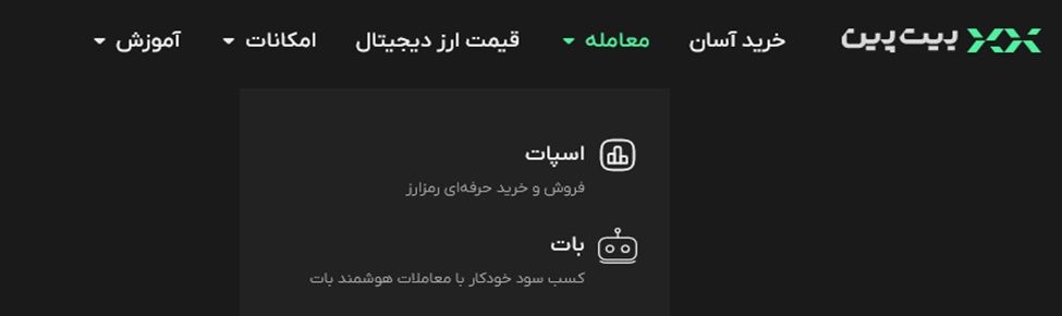 ۱-برای ساخت بات مارتینگل، ابتدا در صفحه اصلی بیت‌پین، گزینه معامله را از نوار بالا انتخاب کنید و سپس بات را بزنید. البته در اپلیکیشن بیت‌پین، گزینه بات مستقیماً در صفحه اصلی در دسترس شماست.