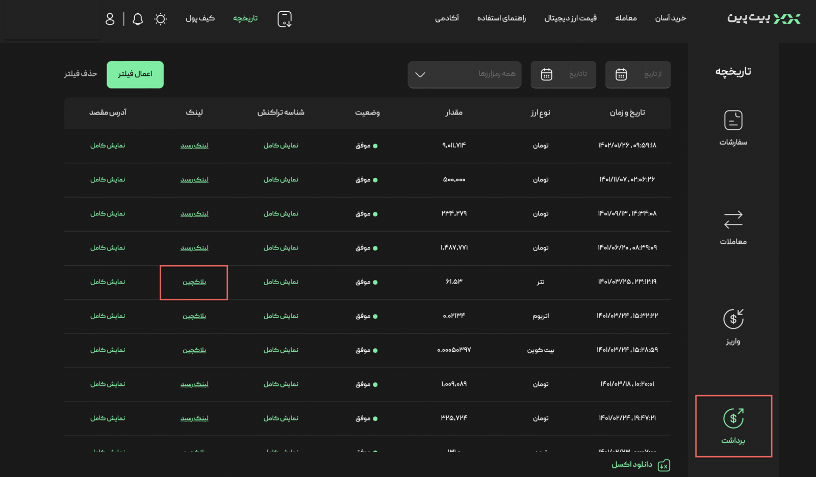 ابتدا به تاریخچه برداشت بیتپین مراجعه کنید و بر روی لینک **بلاکچین **ارز موردنظر مطابق تصویر زیر کلیک کنید.