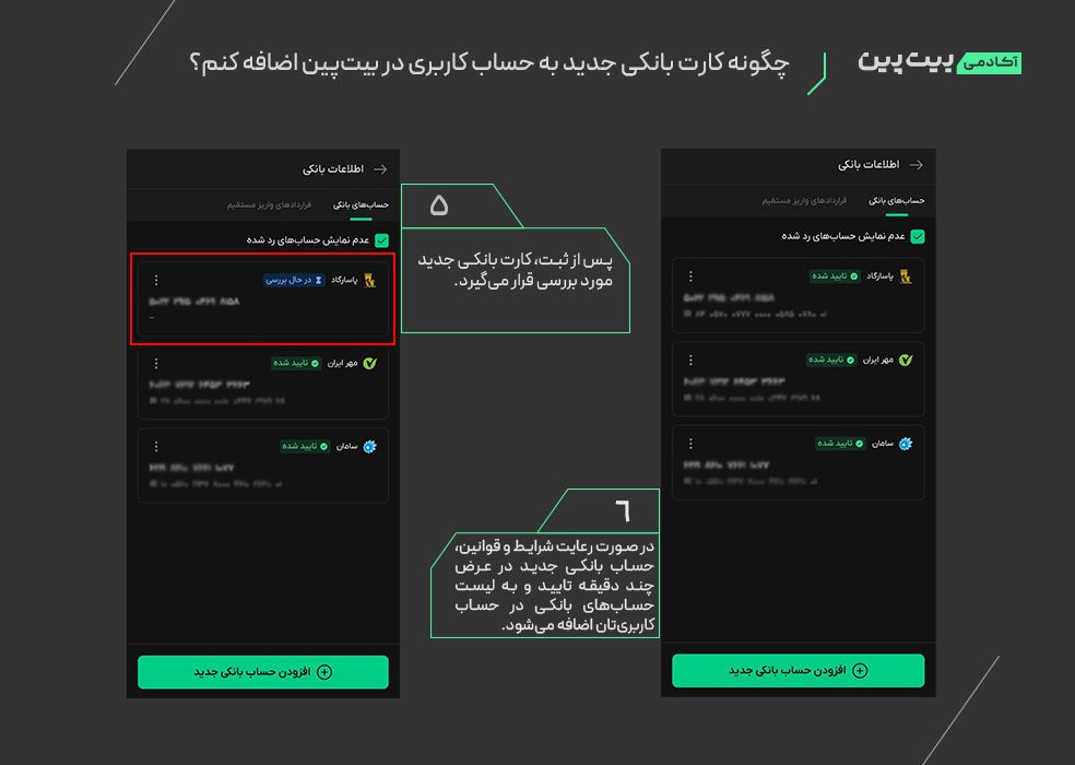 • درصورت رعایت قوانین و شرایط، پس از بررسی و تایید شماره حساب از سمت بیت‌پین، در عرض چند دقیقه کارت بانکی جدید به لیست حساب‌های بانکی شما اضافه و تیک «تایید‌ شده» در بالای شماره کارت نمایش داده می‌شود.