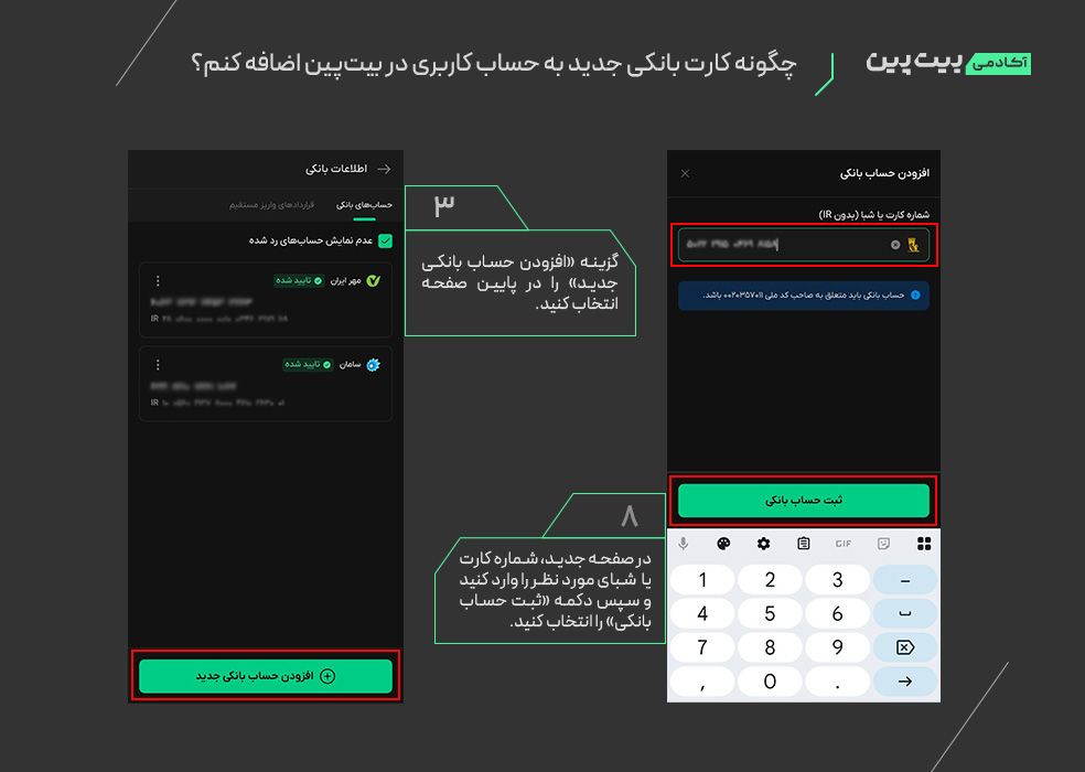اما پیش از اقدام به افزودن حساب بانکی جدید، ابتدا به این موضوع دقت کنید که کارت بانکی مورد نظر باید متعلق به کدملی ثبت‌شده شما در بیت‌پین باشد.