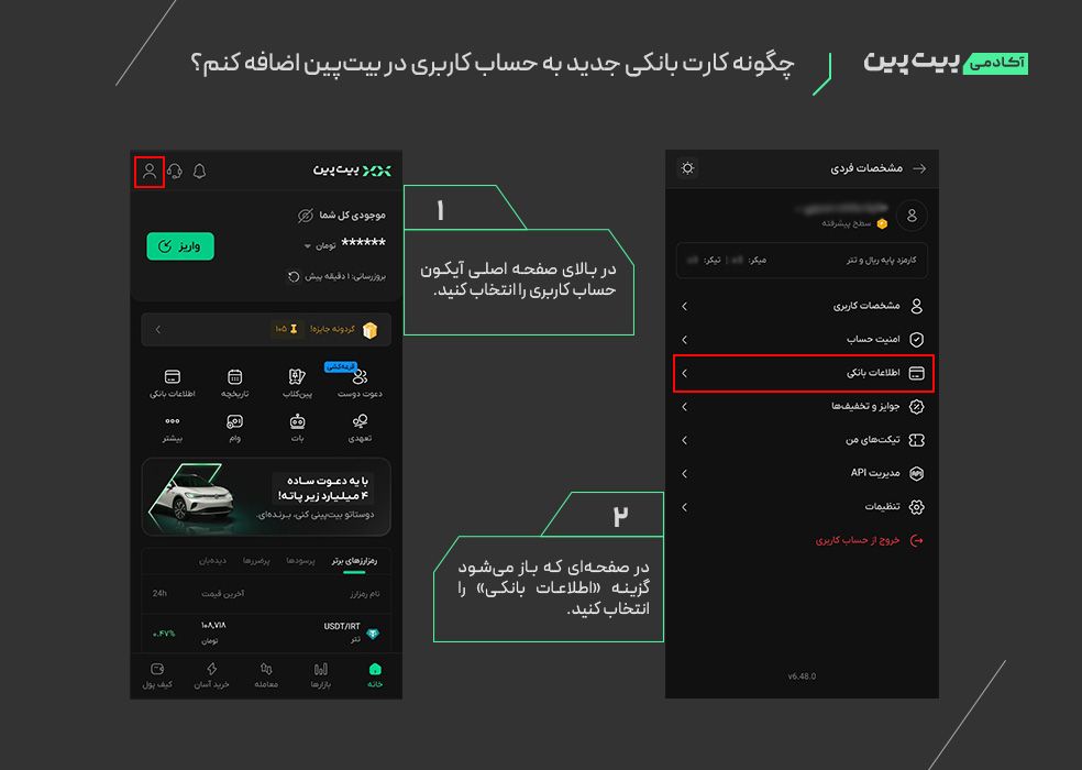 • وارد وب‌سایت یا اپلیکیشن بیت‌پین شوید و در نوار بالای صفحه اصلی، بر روی گزینه «حساب کاربری» و سپس «اطلاعات بانکی» کلیک کنید.