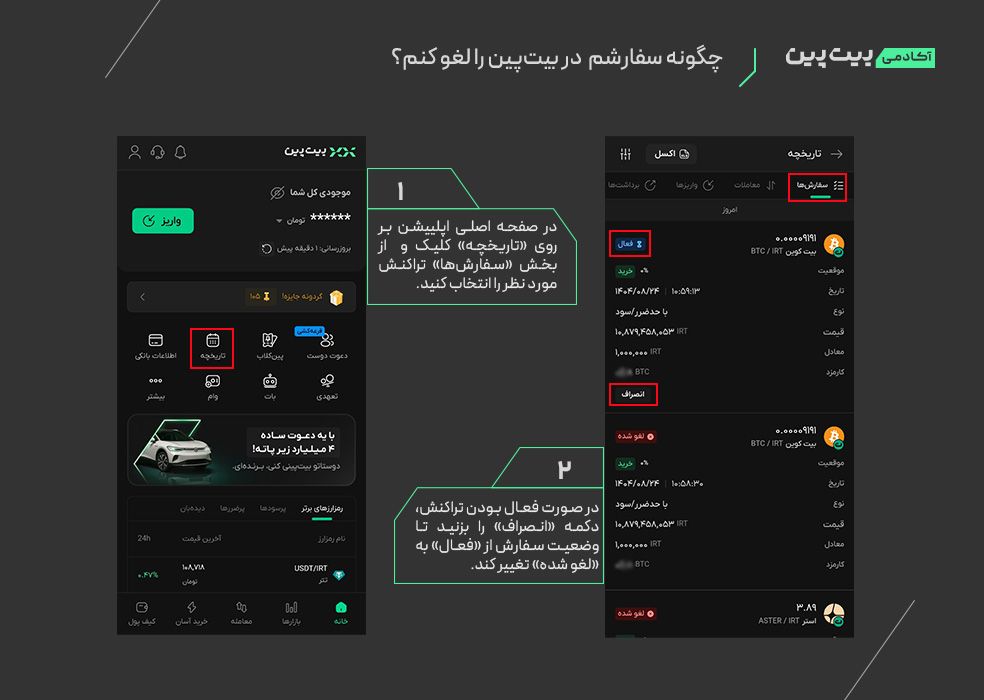 برای لغو سفارش خرید یا فروش خود در بیت‌پین می‌توانید از روش‌هایی که در ادامه آموزش می‌دهیم اقدام کنید؛ اما در ابتدا باید توجه داشته باشید که امکان لغو سفارش در «خرید فوری و آسان ارز دیجیتال» و «سفارش مارکت» در بازار اسپات وجود ندارد.