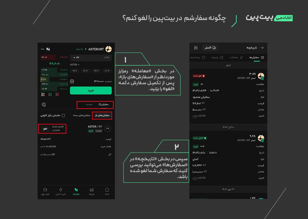 1. از صفحه نخست اپلیکیشن وارد بخش «معامله» ارز دیجیتال موردنظر شوید و در بخش سفارش و «سفارش‌های باز» پیش از کامل شدن سفارش دکمه «لغو» را بزنید. سپس می‌توانید از «تاریخچه» وضعیت سفارش را بررسی کنید.