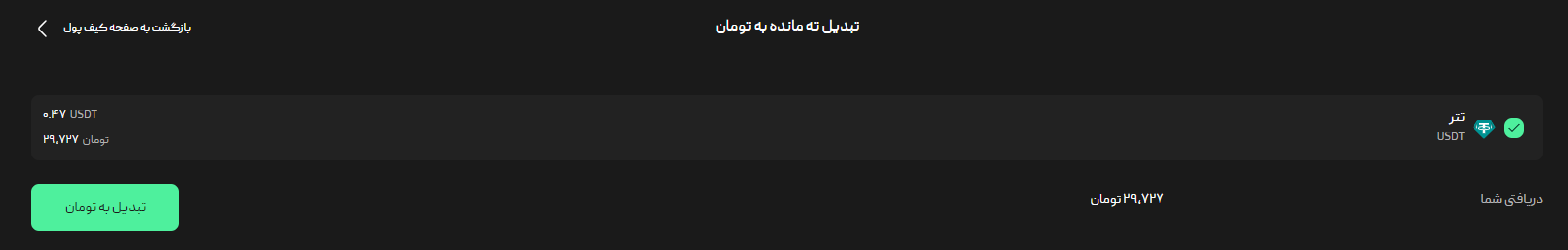 اکنون کافی است مجدداً دکمه تبدیل تهمانده در کادر سبزرنگ را بزنید تا رمزارزهای موردنظر به تومان تبدیل شوند.