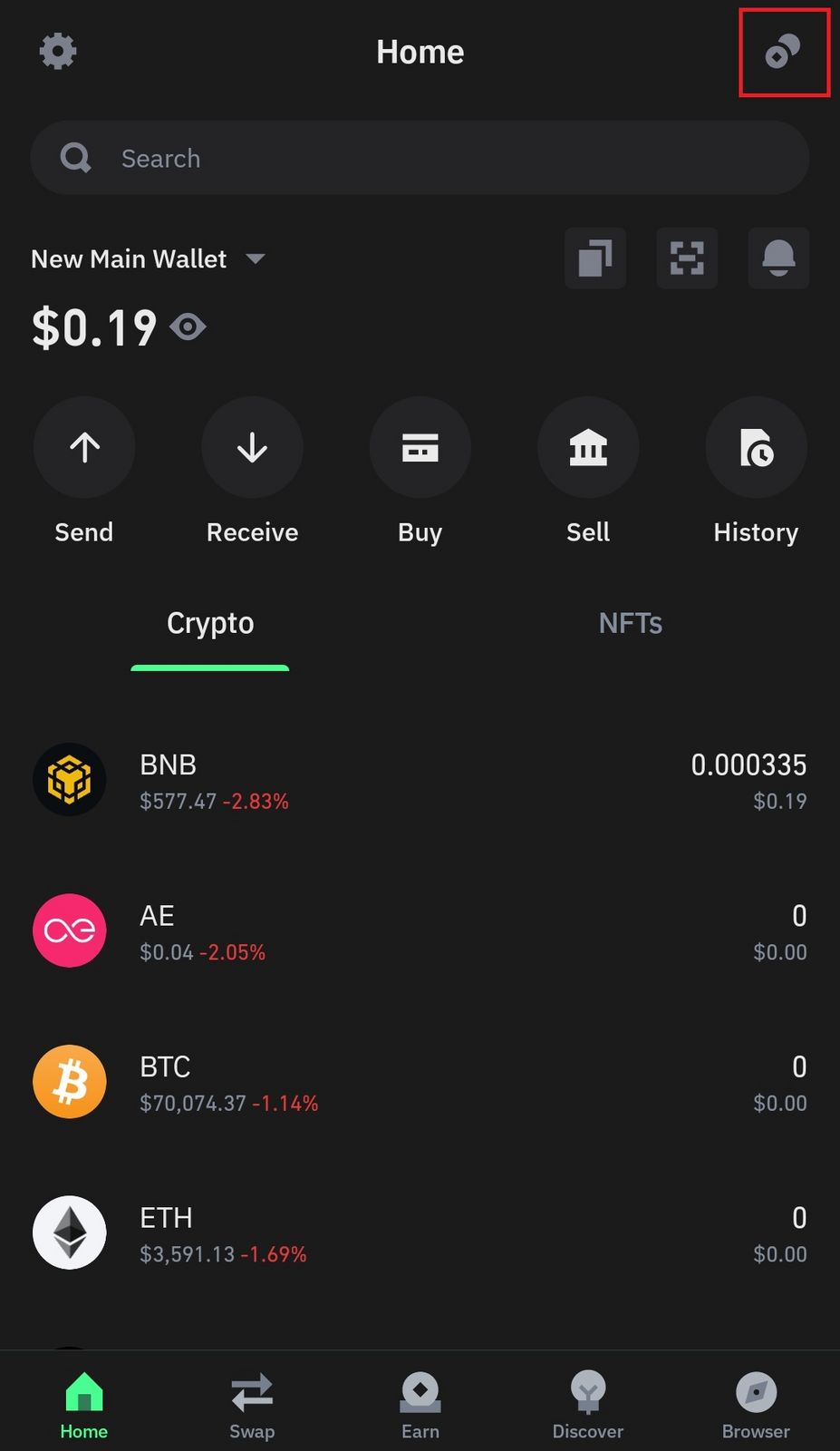 پس از کپی کردن آدرس کانترکت، به تراست ولت مراجعه کرده و در صفحه اصلی، دکمه بالا سمت راست اپلیکیشن را بزنید.