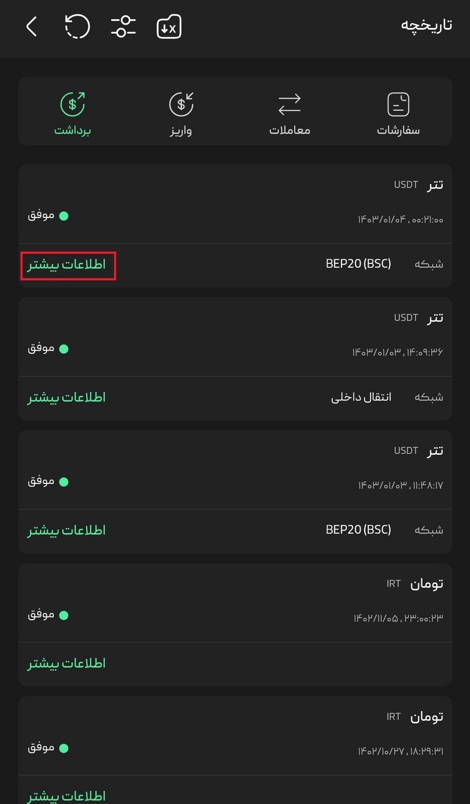 سپس وارد بخش برداشتها شوید و در ردیف تراکنش مربوطه، اطلاعات بیشتر را بزنید.