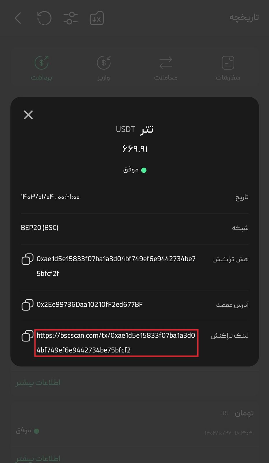 حالا روی لینک تراکنش ضربه بزنید (اگر از نسخه دسکتاپ استفاده میکنید، در ردیف تراکنش گزینه بلاکچین را بزنید).